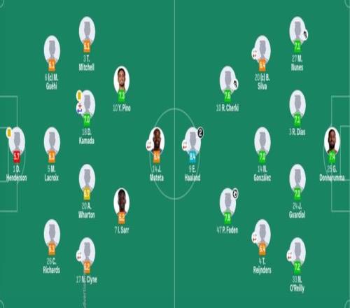 水晶宫首发:1-亨德森、17-克莱因(77'12-乌切)、26-理查兹、5-拉克鲁瓦、6-格伊、3-米切尔、20-沃顿、18-镰田大地(67'19-休斯)、10-皮诺、7-伊斯梅拉-萨尔、14-马特塔(63'9-恩凯蒂亚)